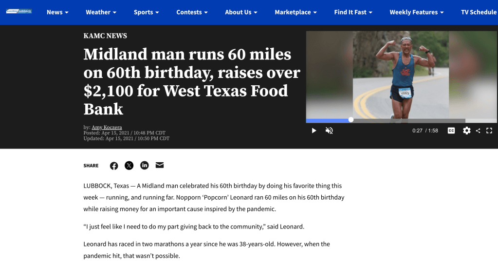 LUBBOCK, Texas — A Midland man celebrated his 60th birthday by doing his favorite thing this week — running, and running far. Nopporn ‘Popcorn’ Leonard ran 60 miles on his 60th birthday while raising money for an important cause inspired by the pandemic.